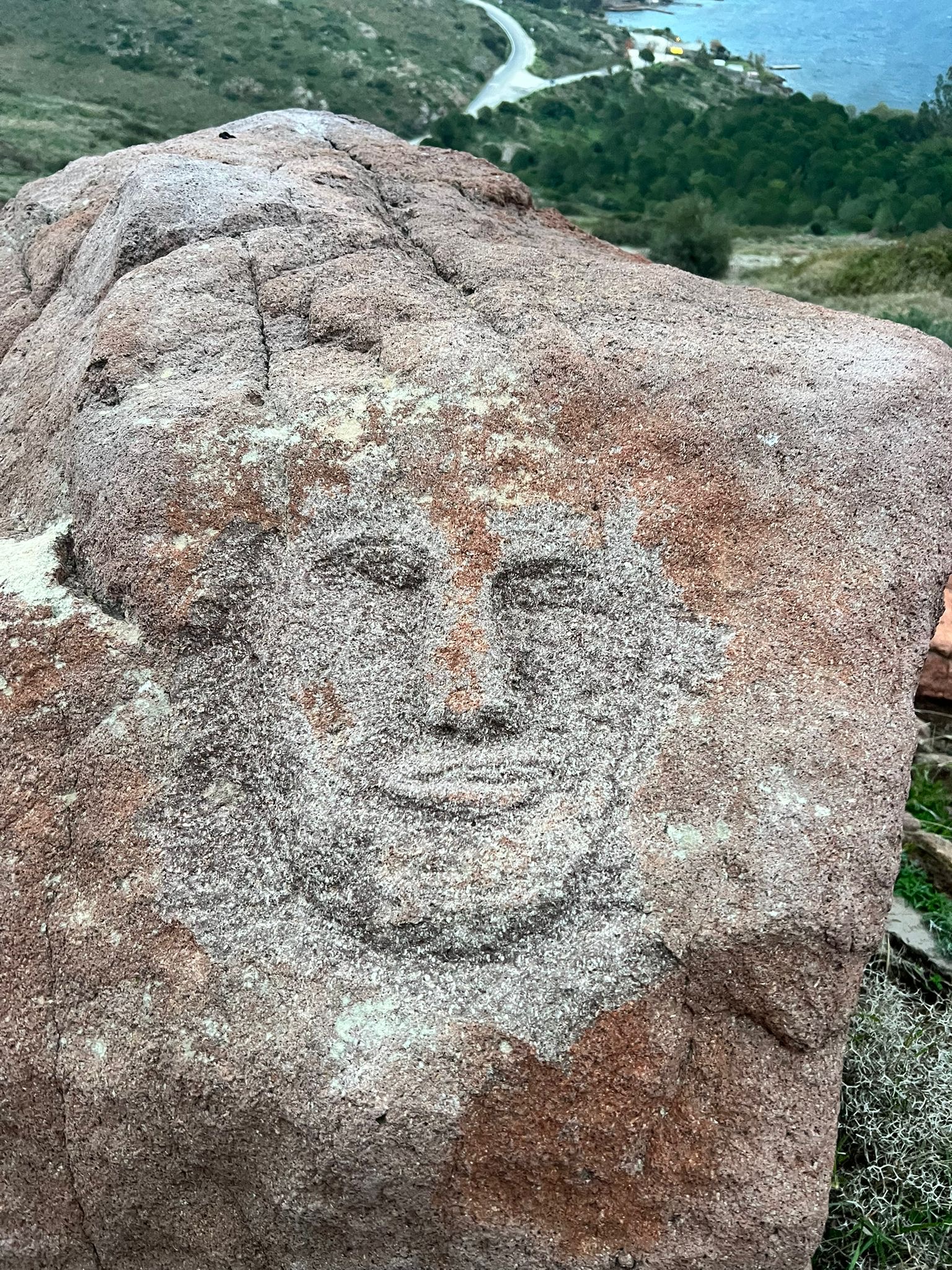 Ama yaklaştıkça taşın yaşıyla hikâyenin yaşı birbirinden ayrılıyor. Kaya eski, evet. Ama yüz… yüz bugüne ait. Antik çağ taklidi değil, modern bir ruh hâli. Taşın üzerinde bırakılmış bir düşünce gibi.