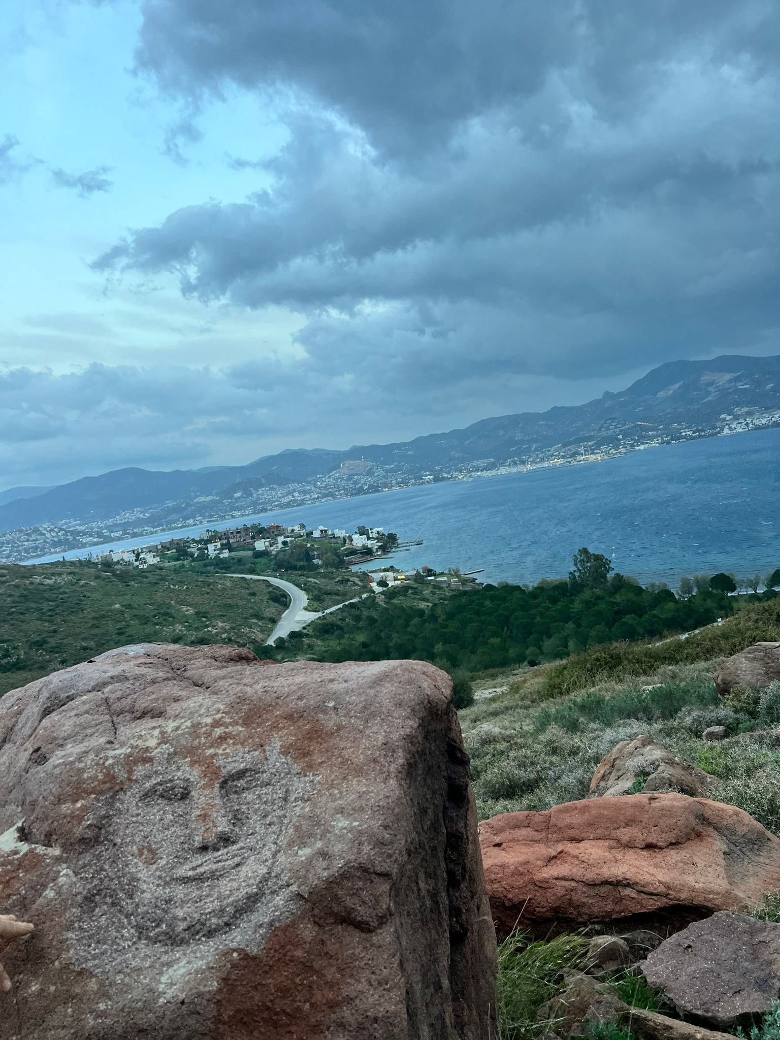 Bir gezinti esnasında, Bodrum Yalıkavak tepelerinde yürürken karşımıza çıkan şey aslında sadece bir kaya değildi. Deniz aşağıda sakince uzanıyor, rüzgâr bildiğini okuyor, gökyüzü “birazdan bir şey olacak” havasında… Ve tam o anda, sanki yolun kenarında bizi bekliyormuş gibi duran bu yüzlerle göz göze geliyoruz. Ya da daha doğrusu, gözleri kapalı oldukları için biz onlara bakıyoruz.